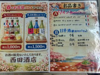 皆さんこんにちは西田酒店スタッフ浩子です。七尾パトリアで行われましたイベント、【春のお花見グルメマーケット】に参加してきました!1階の一画を陣取って準備から始まった当日。前回にも思いましたが、準備がいかに大切か思い知りました。どこに並べよう...